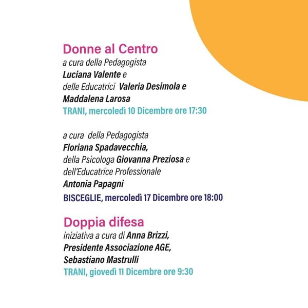 Tutti i dettagli saranno forniti nel corso degli incontri: martedì 23 e lunedì 29 dicembre alle 19.00 nell’Auditorium don Pierino Arcieri di Epass (piazza C.A. Dalla Chiesa 12, Bisceglie); martedì 30 dicembre alle 19.00 presso gli spazi della Parrocchia Angeli Custodi (via Papa Giovanni XXIII, Trani).