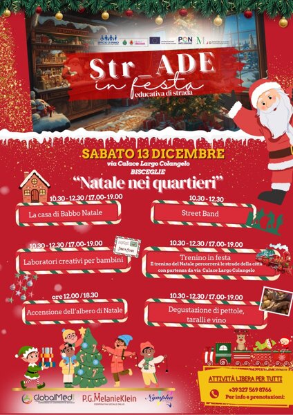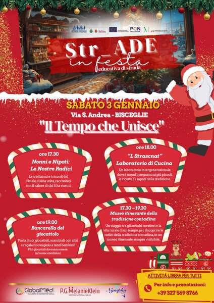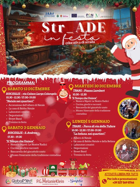 “Str-Ade in Festa” è il primo appuntamento del nuovo servizio di Educativa di Strada dell’Ambito Territoriale Sociale di Trani - Bisceglie che prenderà avvio per la prima volta sul nostro territorio in occasione delle festività natalizie. Il servizio è gestito dal Consorzio di Cooperative Sociali Global Med Care e dalla esecutrice Cooperativa Sociale P.G. Melanie Klein, aggiudicatari, insieme all’esecutrice Cooperativa Sociale Nympha, dell’Appalto - procedura aperta telematica ex art. 71 del D.Lgs. n. 36/2023 per l’affidamento del servizio di “Assistenza Domiciliare Educativa (ADE) ai sensi dell’art. 87 bis R.R. 4/2007 ss.mm.ii. e TERRITORIALE Legge 328/2000” per la durata di due anni.